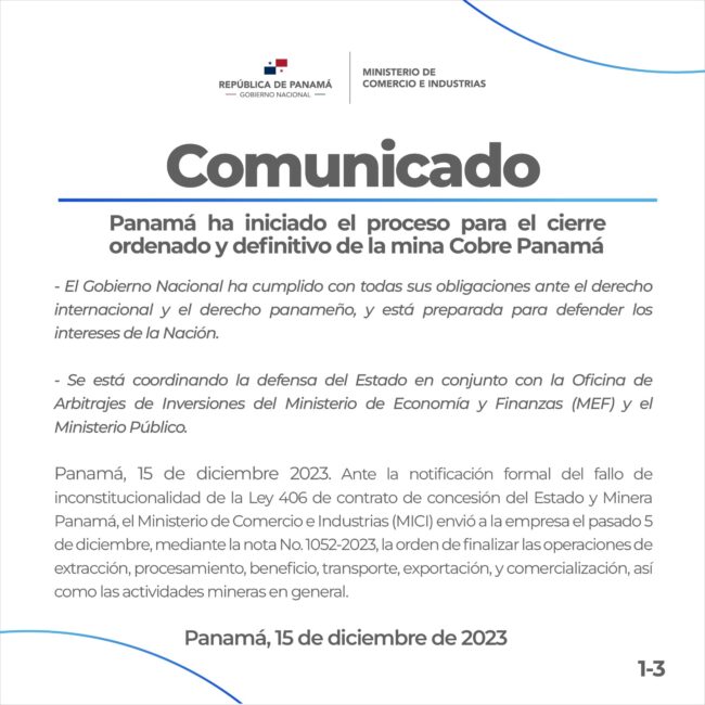 Panamá ha iniciado el proceso del cierre ordenado y definitivo de la mina Cobre Panamá