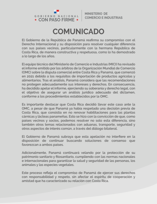 El equipo técnico del Ministerio de Comercio e Industrias (MICI) ha revisado el informe emitido por los árbitros de la Organización Mundial de Comercio (OMC) sobre la disputa comercial entre Costa Rica y Panamá.